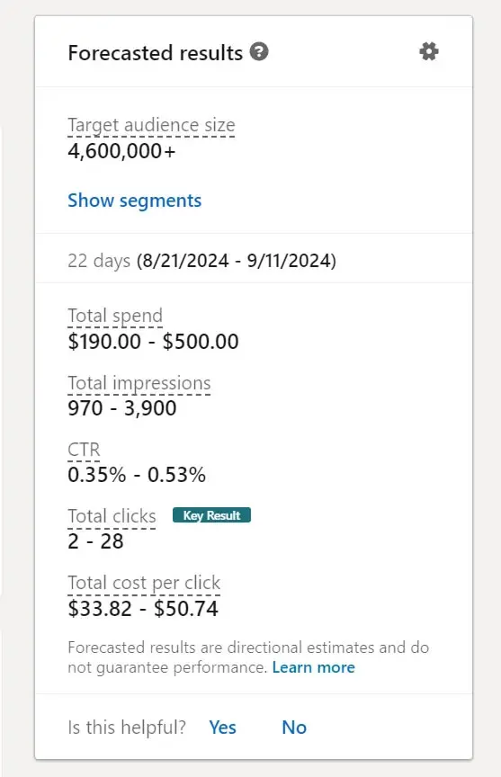 Média de CPM no Linkedin: U$33,80 (esse valor pode variar bastante, a depender da localidade e público selecionado, entretanto)