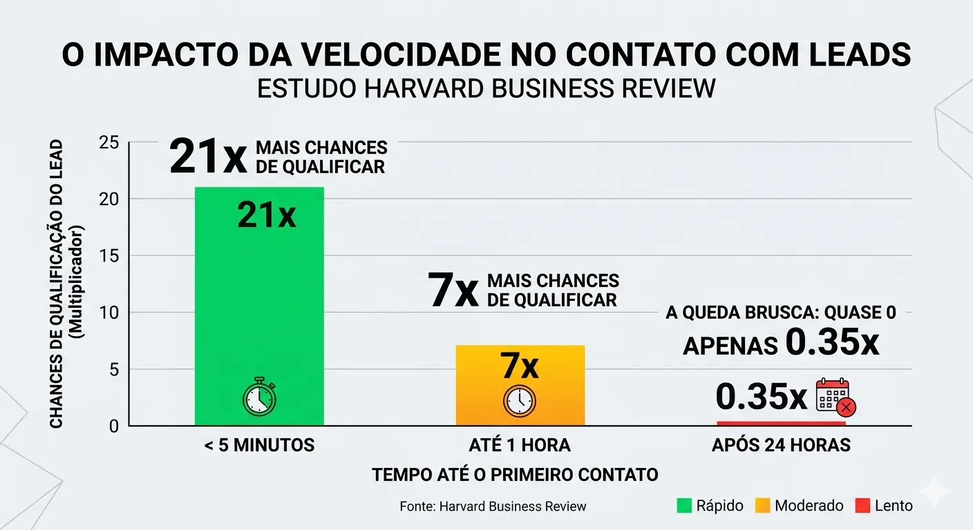 Em 2011, a Harvard Business Review conduziu um outro estudo com 2.241 empresas e também concluiu que o atendimento do lead em menos de 5 minutos eleva as chances de qualificação em 21x e que no dia seguinte, as chances caíam em mais de 60x