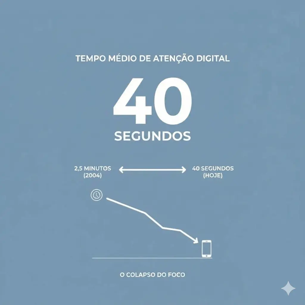 Tudo joga contra isso: Tanto a necessidade do usuário de querer algo na ponta dos dedos de forma imediata, quanto o volume colossal de informações disponíveis na tela, criam um efeito geracional onde o tempo de atenção do usuário é cada vez menor. Estudos mostram que o tempo médio de atenção em tela de uma pessoa é de aproximadamente 40 segundos. O tempo de atenção dedicado a uma publicação em rede social (como seu anúncio) é ainda menor: de 3 a 8 segundos!