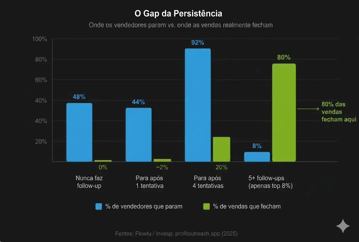Na verdade, estudos mostram que embora sejam necessários de 5 a 12 contatos para efetivar uma venda na internet, 44% dos vendedores desistem do lead na primeira abordagem, deixando uma enorme e deliciosa quantidade de dinheiro na mesa, simplesmente por desistirem cedo demais do lead.